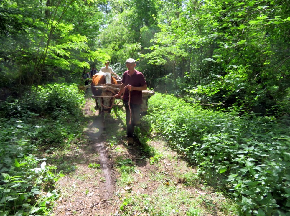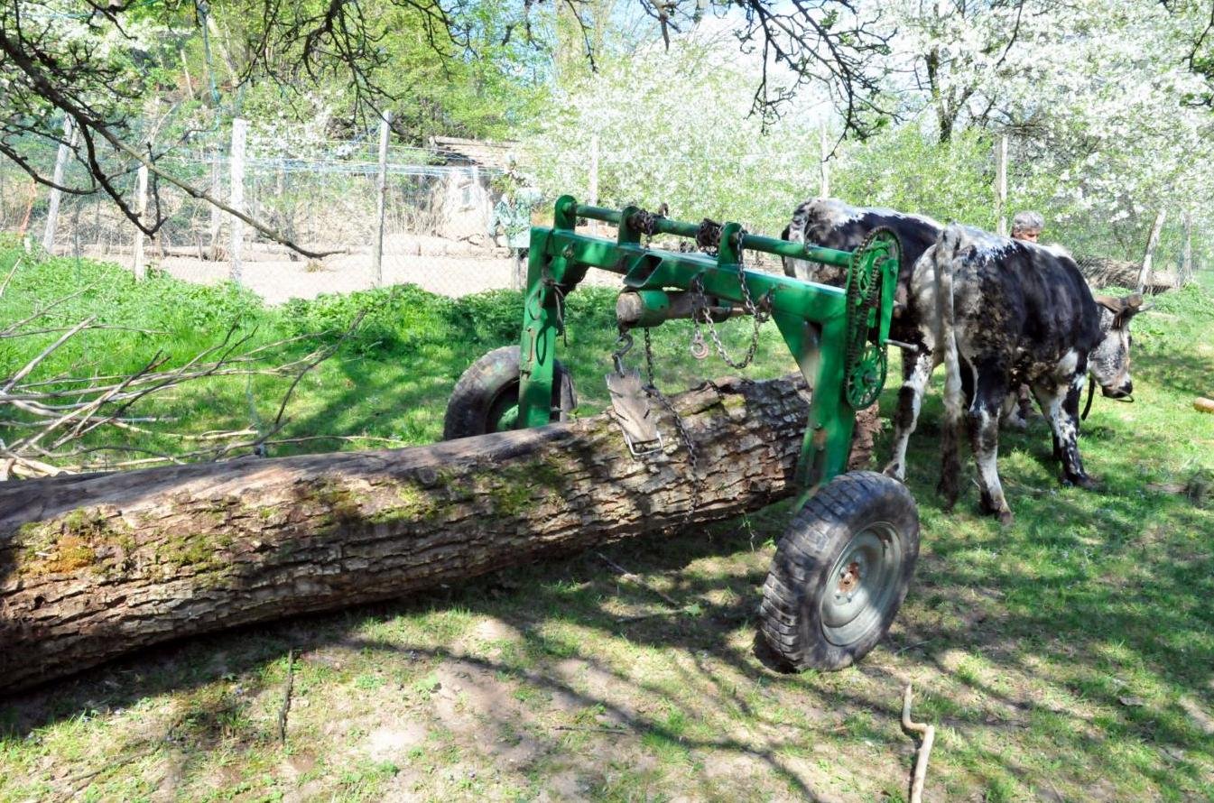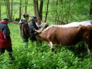 Après le déjeuner, version auberge espagnole, nous montons à l’étable pour laisser place à ceux qui attellent les bœufs – dont un Vosgien rouge et blanc (ces derniers représentant environ 5% des naissances). Philippe insiste toujours sur le fait de ne jamais les monter ou descendre sans faire quelque chose d’utile, par exemple, ramasser une bûche supplémentaire laissée au bord du chemin. Même un petit aparté comme celui-là réunit tout le monde pour s’essayer à porter une bûche de la meilleure façon, celle-ci étant à peu près à la limite du poids qu’une personne seule et de taille moyenne, femme ou homme, peut contrôler, en l’équilibrant sur la hanche. Cet exercice nous procure l’occasion de bien rire ensemble du côté comique des premiers essais, mais tous ceux qui s’y aventurent réussissent à bien faire en peu de temps. Concernant une tâche fréquente de débardage, Philippe nous montre comment ajuster la chaîne de tirage, positionner la paire de bœufs attelés, puis les guider pour tirer la chaîne vers l’avant afin de pousser une bûche entre deux pierres posées dans l’allée de la ferme. Il s’agit d’une répétition en vue de la démonstration publique prévue le samedi dans le village du Valtin, de l’autre côté du col de la Schlucht. Les deux bœufs de Philippe sont tellement habitués à faire cette manoeuvre qu’ils font tout le « tour » en moins de deux : sortir une bûche du tas situé près de leur pâturage, la pousser entre les deux pierres, puis la replacer de nouveau avec les autres.