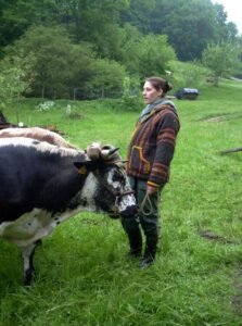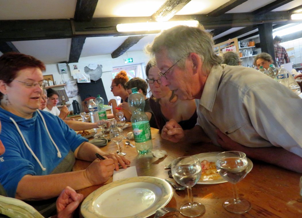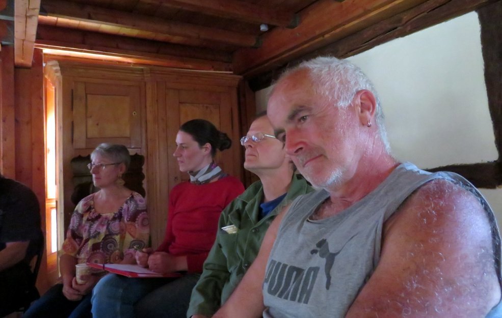 Pauline explique aussi quelques-unes des limites légales de la profession de l’ostéopathie animale – un point toujours important dans ces métiers de soin – puis nous montre des pratiques de massage ou des points de pression, correspondant à chaque problème. Tout d’abord, comment passer la main près de la colonne vertébrale pour détecter où se situent des points de chaleur. Elle encourage ensuite plusieurs d’entre nous à essayer, et cela va confirmer que, en général, même un novice total peut trouver les mêmes points trop « chauds » que l’experte. Cette séance étant spécifiquement ouverte aux savoirs des autres, Philippe, Joël Blanc et Guy Chautard nous montrent leur propres « tours ». Par exemple, Guy pratique une technique de massage consistant à soulever la peau du dos. Plusieurs séances ultérieures à la ferme ou au village du Valtin laissent le temps à d’autres encore d’« étudier » brièvement avec Pauline. Quelques membres un peu plus âgés de l’assemblée souffrant d’arthrite, les séances de massage se sont même étendues à un genou humain, ce que le propriétaire du dit genou a qualifié de réel succès, mais c’est une autre histoire… Ce sont surtout les liens entre générations qui sont déterminants, comme l’a dit Guy à un moment donné – « j’aime donner ce que je sais, je ne sais pas tout, j’ai encore beaucoup à apprendre ». Le réseau de bouviers doit réussir à assurer ce partage des savoirs. Citons l’écho venant d’une des jeunes bouvières – « je me rends compte qu’on ne sait pas faire grand-chose et on sent que le monde va changer ».