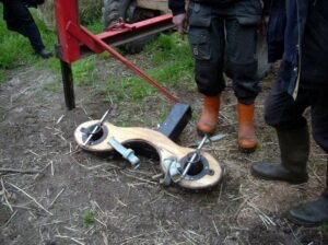 La pluie a décidé que ce n’était pas le moment d’insister, et nous pouvons assister à la toute première présentation d’une création de Corentin Huber. C’est parfaitement dans l’esprit d’inventivité de Philippe, qui construit ou modifie des outils pour ses propres besoins, comme les coussinets frontaux attachés directement au joug, ou son ramé, le chariot élévateur-pousseur, actionné par une paire de bœufs qui pivotent pour faire marcher l’engin – le tirant ou le poussant. C’est parfait pour convoyer des grumes ou des branchages, des bottes de foin et autres. À plusieurs reprises, Philippe nous rend attentifs à des détails. Ce sont précisément ces détails qui comptent pour la sécurité des meneurs et le bien-être des animaux. Par exemple, trouver des courroies pour les jougs de têtes qui ne gênent pas les bœufs. Pour un attelage « éducatif » à trois bêtes, composé de deux jeunes derrière un bœuf expérimenté, comment sécuriser la chaîne qui les relie pour ne pas accrocher les cornes ni toucher l’oreille ? En effet, une chaîne laissée trop lâche pourrait prendre la bête sous la mâchoire. Ajoutons que le meneur lui-même doit faire attention. S’il met les pieds des deux côtés de la chaîne, et que les bêtes démarrent rapidement, il peut avoir une surprise douloureuse…