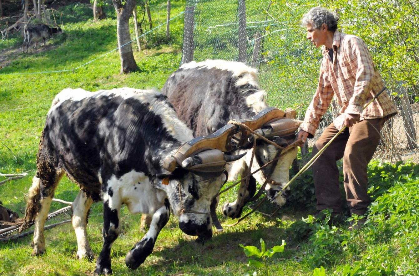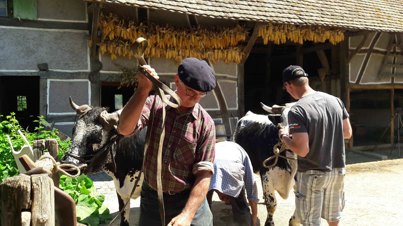 Corentin Huber, les bœufs et son invention, le joug de garrot et de tête, Soultzeren, Alsace, Photo Léonnie Biteau