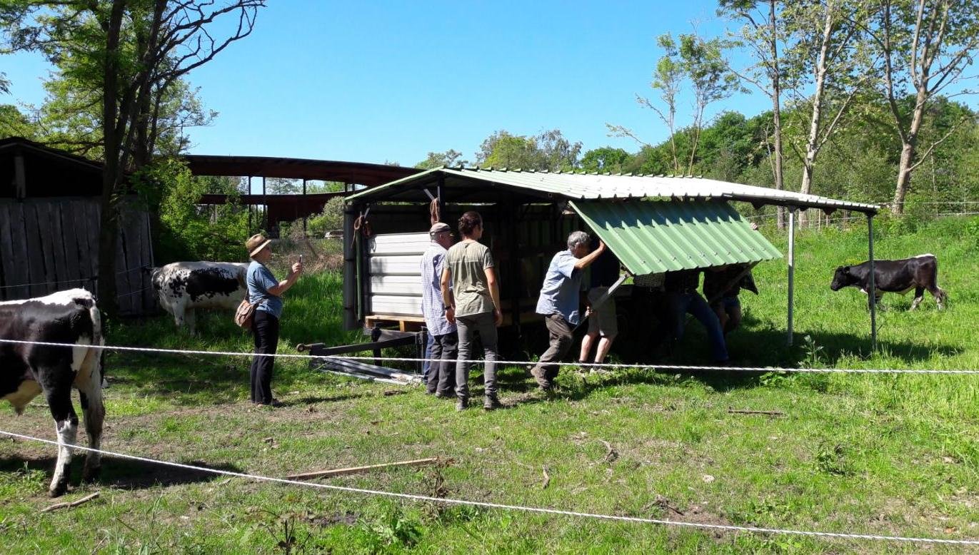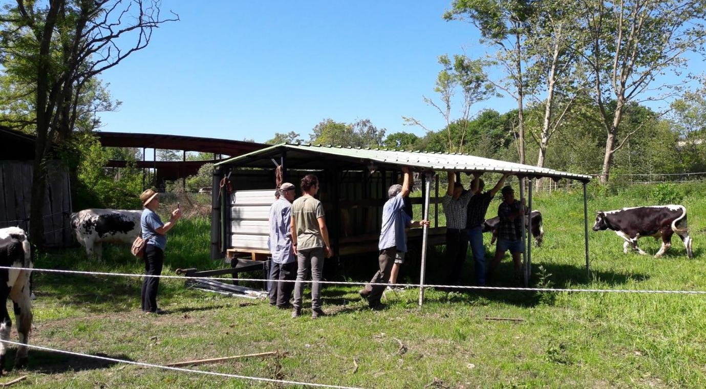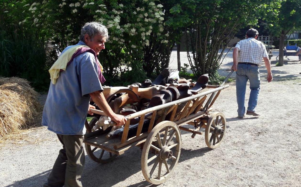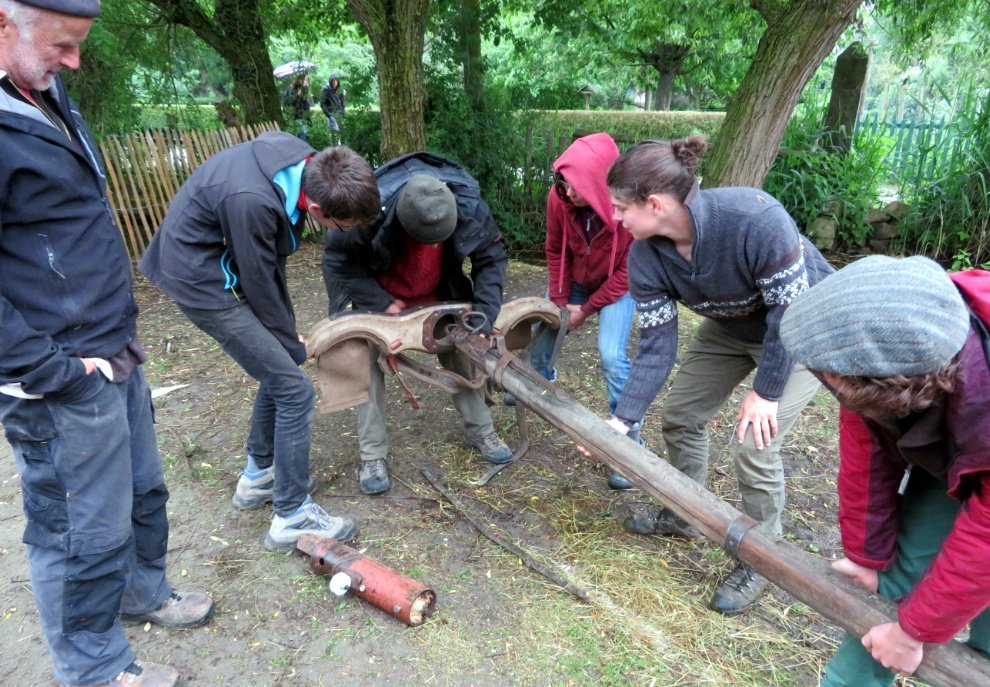 Un soupçon de pluie nous accompagne aux premières heures du dimanche (ou comme le dit un participant, « il pleut mouillé »), mais nous sommes bien à l’abri pour la synthèse finale. Comme tout au long du programme, on fait valoir le principe de souplesse, ne serait-ce que pour s’adapter aux souhaits exprimés par les divers participants. Par exemple, les bouviers vendéens auraient tellement voulu s’essayer à la construction d’une charrette chez Michel Nioulou, mais le temps a manqué. Chez Philippe le dimanche matin, ils tombent sur un châssis de chariot et coupent le bois pour fabriquer presque instantanément une charrette. Effectivement, la veille pendant la nuit, ceux qui dormaient à la ferme ont bien remarqué un bruit un peu mystérieux…