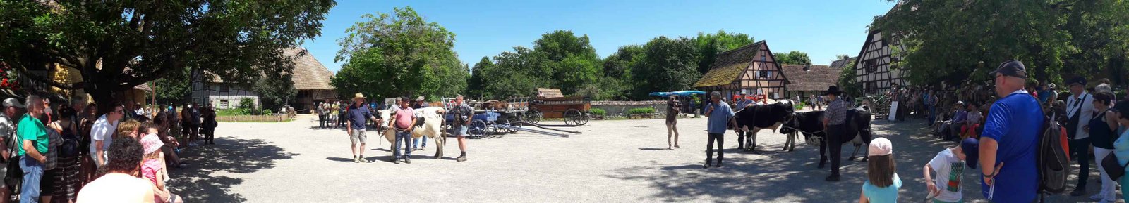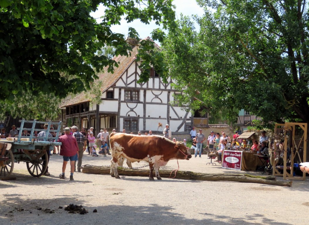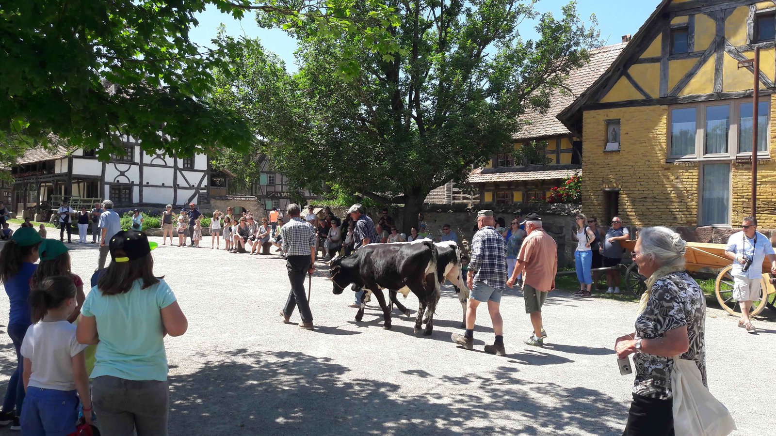 En bas, un public nombreux est venu pour regarder les bouviers, mais aussi pour se détendre en dansant sur la musique de Gilles et de Danyèle. Philippe n’hésite pas à chanter en français et en alsacien – et même une chanson consacrée aux « Bovins d’abord. Tout le monde profite des stands proposés par les bénévoles de la commune où il y a de tout, du crémant d’Alsace aux hotdogs façon valtinoise. Beaucoup s’essaient à un concours de coupe de petites billes à la scie passe-partout. À la fin de la journée, il y effectivement un amas impressionnant de disques en bois, mais il règne une certaine discrétion sur les gagnants, ce qui nous amène à conclure que tout le monde était un champion.