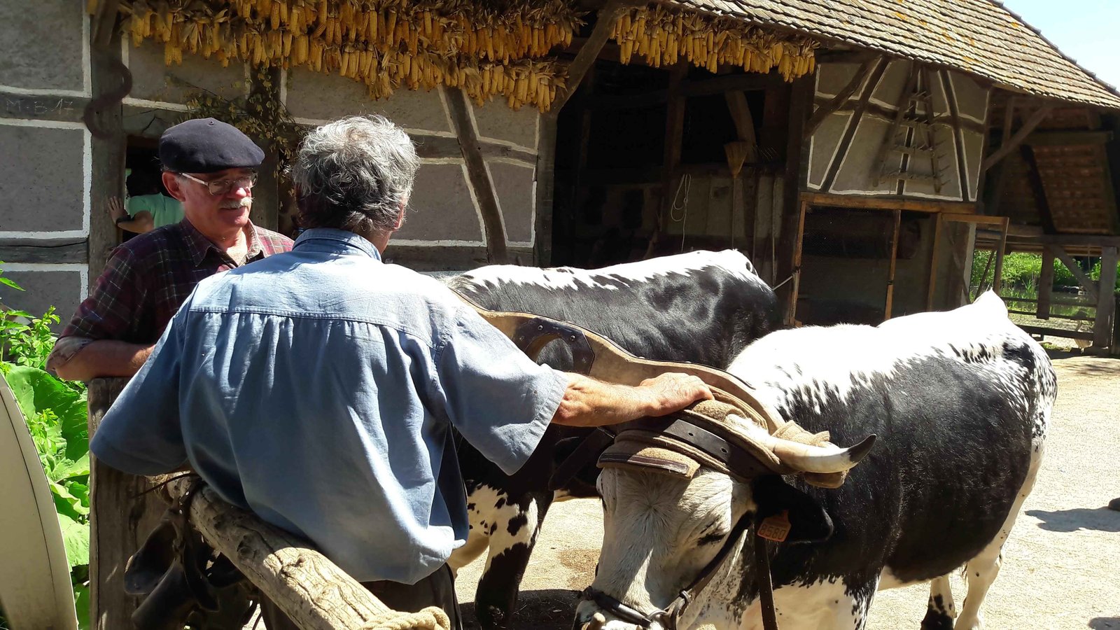 C’est alors que Gilles Péquignot et Danyèle Besserer du groupe de musique traditionnelle « Au gré des vents » arrivent pour leur première intervention durant ces quatre journées. Gilles est un voisin de Philippe et ami depuis longtemps de Michel Nioulou, au point qu’il s’est décidé pendant le confinement de se mettre aussi à la taille des jougs (voir Sabots N°108 mai-juin 2022). Danyèle et Gilles ajoutent chaque jour à l’ambiance festive et amicale de la rencontre – à la ferme à Soultzeren, au village du Valtin le samedi et à Soultzeren le dimanche. La convivialité étant déjà bien en place, nous recommençons nos échanges sur les enjeux de la traction bovine, sur l’avenir des agricultures à petite échelle à travers l’Europe et au-delà, et surtout sur le sujet crucial de la transmission des savoirs et sur la manière de construire une image positive de la traction animale. Comme le bouvier alsacien André Kammerer, qui à sa retraite s’est lancé le défi de ne plus conduire des trains, mais des bœufs, et qui a transmis cette passion à son petit-fils Corentin. Les conversations entre générations fusent et, à la fin, Guy Chautard, l’éleveur de Ferrandaises, passe à Corentin son béret avec le blason de la race en symbole de la transmission.