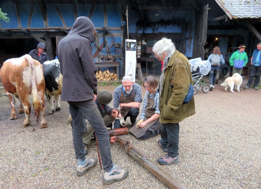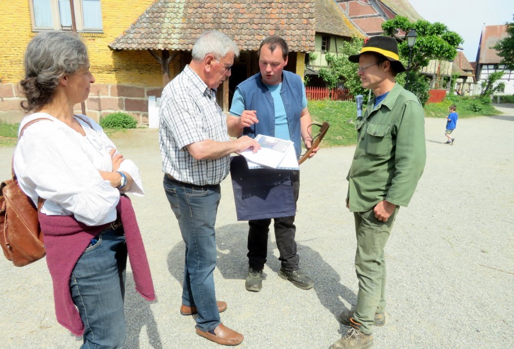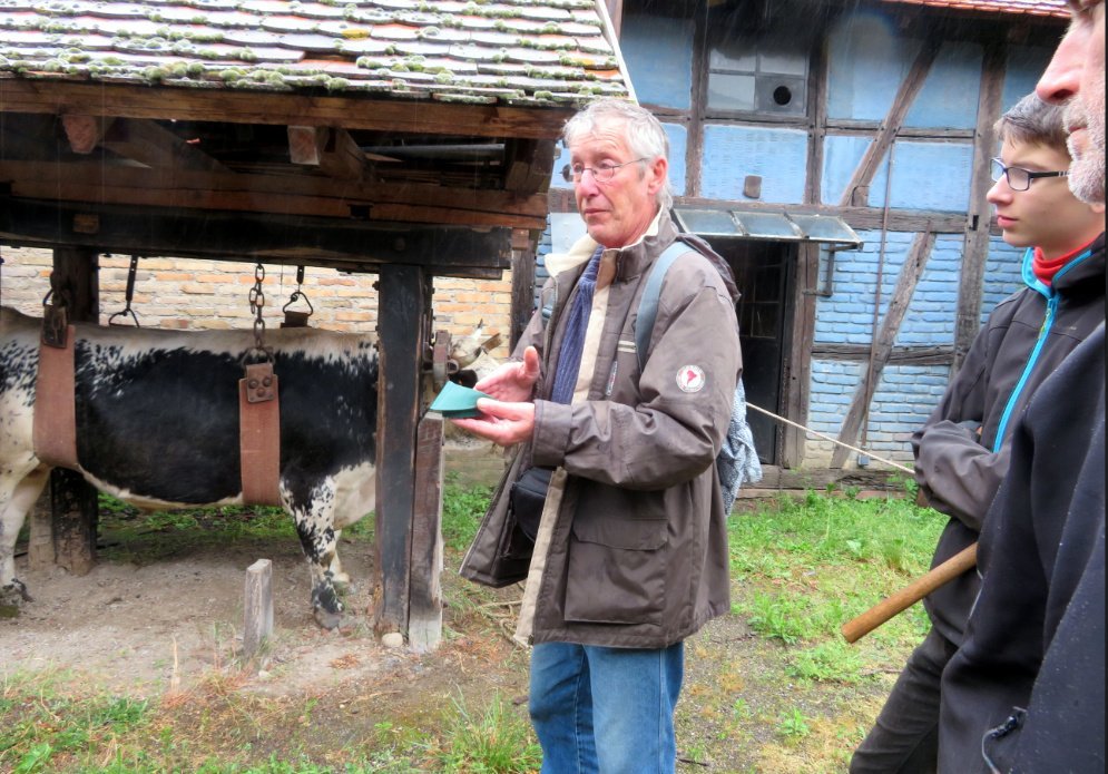 Au fur et à mesure qu’avance la journée de vendredi, nous sommes rejoints par d’autres participants, dont Claus Kropp, Président de l’AIMA (Association Internationale des Musées Agricoles), venu de la ferme expérimentale d’archéologie de Lauresham au sein de l’Abbaye de Lorsch dans le Land de Hesse en Allemagne, un site classé au patrimoine mondial de l’UNESCO. Claus compte parmi les nombreux participants à avoir suivi un des stages de Philippe à l’Ecomusée d’Alsace, mais il vient cette fois « armé » d’un dynamomètre pour une expérience technique…