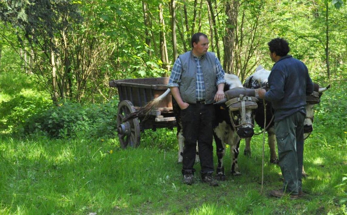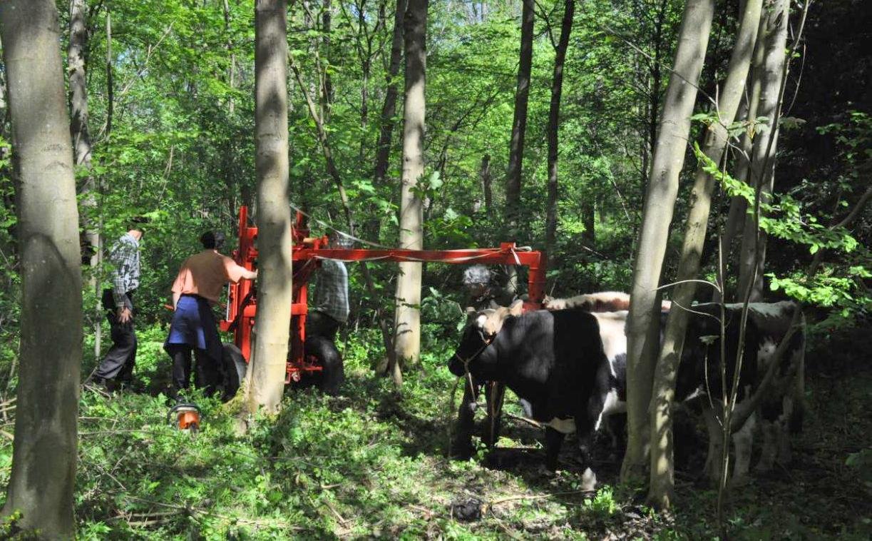 Le Valtin étant tout proche de musées consacrés aux métiers du bois, du débardage ou du schlittage, Philippe porte donc une schlitte jusqu’en haut de la pente, tandis que son équipe scie le bois, ramasse les branches et charge le traîneau que Philippe descend au pas de course, seule activité de travail effectuée sans les bœufs.
