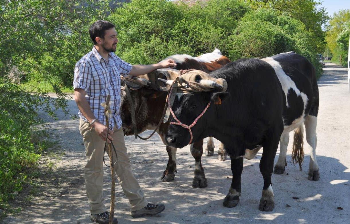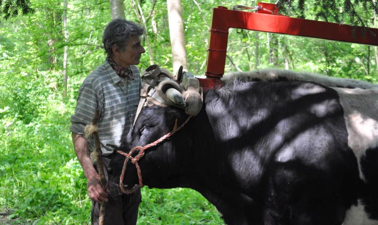 Corentin Huber, les bœufs et son invention, le joug de garrot et de tête, Soultzeren, Alsace, Photo Léonnie Biteau