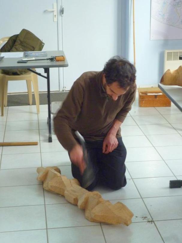 Lionel Rouanet au travail à la hâche