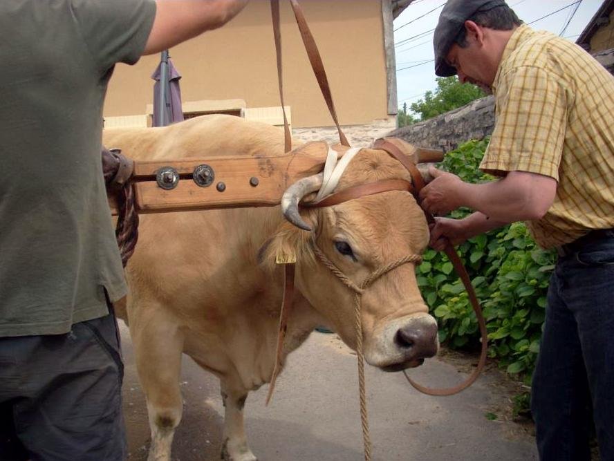Ses jeunes boeufs Aubracs n’avaient plus de joug à leur taille. C’est pourquoi il a fallu en tailler un neuf adapté à leurs tailles et à leurs cornes.