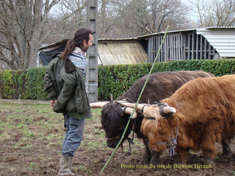Actuellement, il a une paire de bœufs Highlands (Targos, le noir et Marzin, le roux) achetés à 8 mois dans un élevage à viande dans le Gers. Ils ont été castrés à 18 mois et ont maintenant 6 ans.