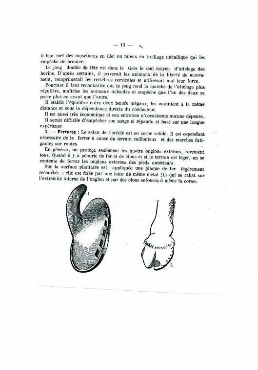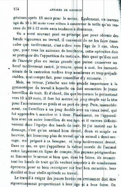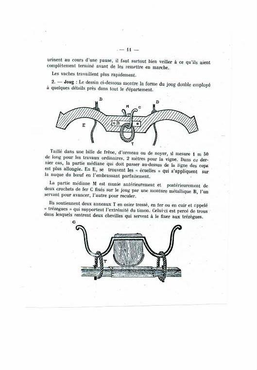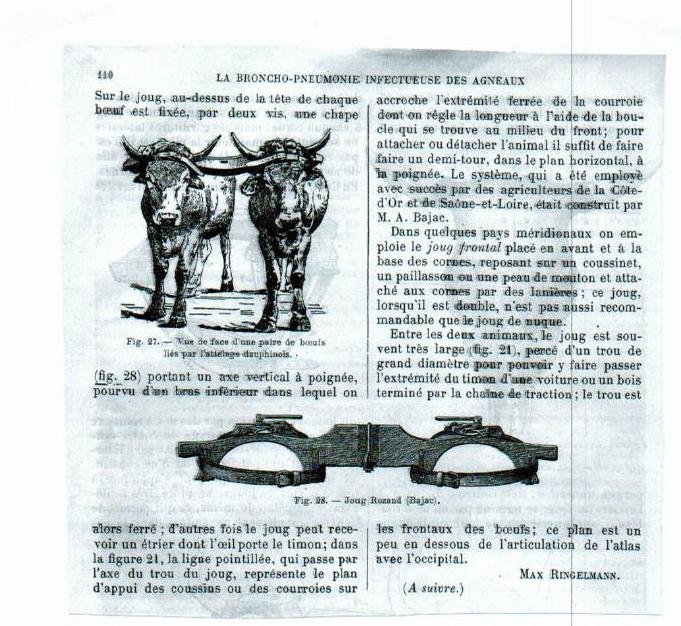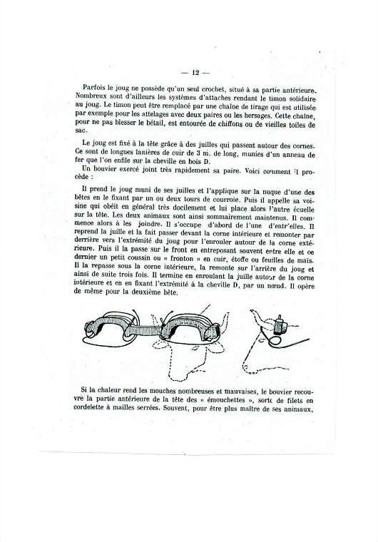 De son côté, Corentin est parti sur une tout autre piste en se laissant inspirer par une observation attentive des avantages et des inconvénients du joug de garrot et du joug de tête. Donc, il invente une transition du premier au deuxième. Or, les bœufs n’ont pas l’habitude du joug de garrot et passent par quelques moments d’hésitation. Pourtant, ils réagissent rapidement et bien à la nouveauté, surtout parce qu’ils ont l’habitude de travailler ensemble, et que Corentin est un meneur expérimenté. Il lui suffit de leur mettre le joug de garrot, de dérouler le coussin feutré sur le front, d’attacher la courroie-ceinture à boucle sur le front, d’enlever la goupille pour détacher les arcs et, voilà, qu’un joug en devient un autre !