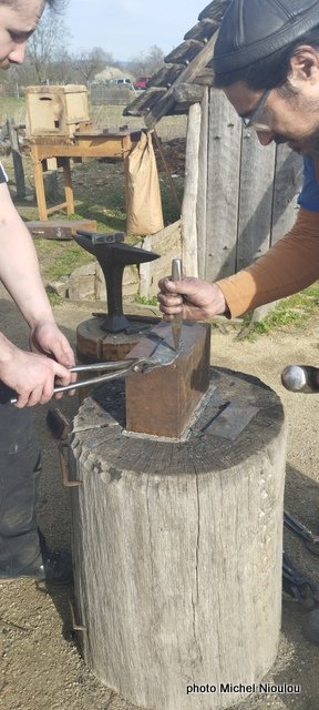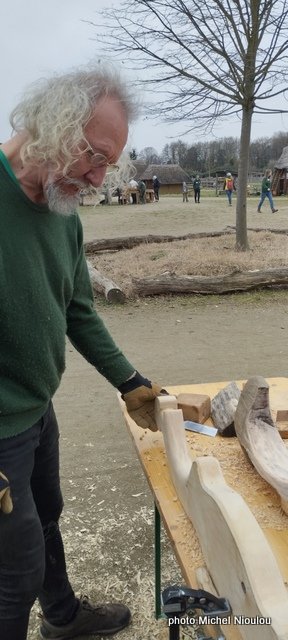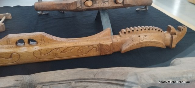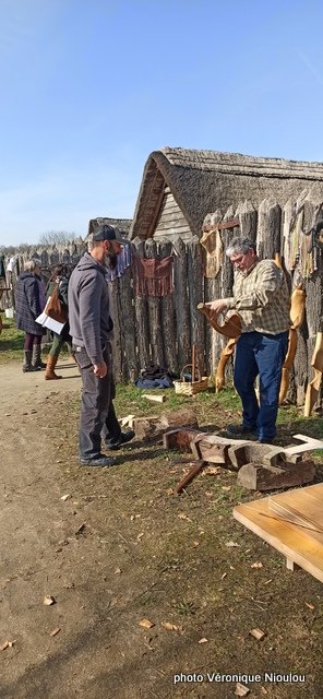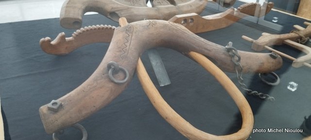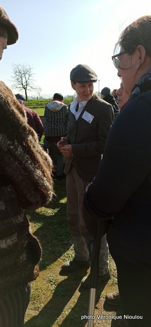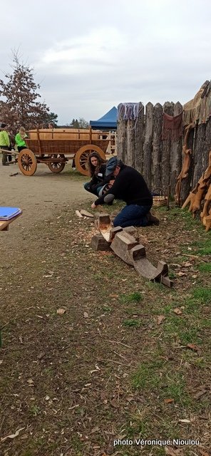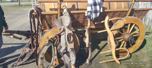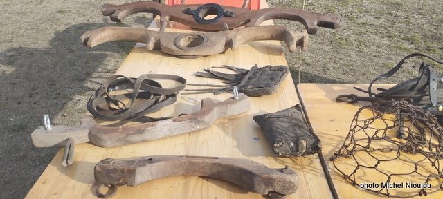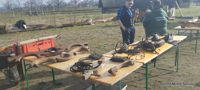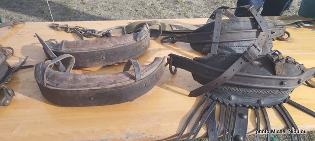 Côté matériels, accessoires et informations, Léonnie Biteau à l’accueil tenait à disposition différentes documentations dont le livre sur l’attelage bovin de Philippe Kuhlmann. Laurent Martin présentait son entreprise autour de l’attelage bovin (prestations, médiation, formation à la traction bovine…) avec documents et matériel ludique. Eline Hoefsloot de Enveitg (66) proposait de nombreux colliers trois points d’occasion remis en état. Emmanuel Fleurentdidier de la région de Montmorillon (86) avait aussi différents jouguets et accessoires en lien avec l’attelage bovin. Léa Rigal, jeune bourrelière de Blanzat (63) avec son entreprise « Les Vaches seront bien Gardées » présentait un licol de sa fabrication et a échangé avec les meneurs afin de cerner les besoins en bourrellerie pour les bovins. Véronique Nioulou, passionnée de travaux de fil, présentait des vire-mouche tressés selon des méthodes traditionnelles et un atelier qui a permis à quelques personnes d’apprendre la technique de tressage de ces indispensables accessoires pour lutter contre les mouches pendant l’attelage . Michel Nioulou présentait différents jougs anciens ou neufs de sa fabrication ainsi que des démonstrations de confection de coussins d’attelage en paille.