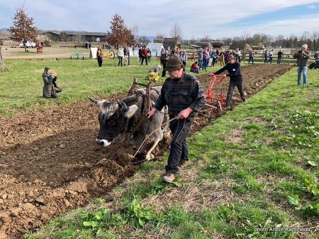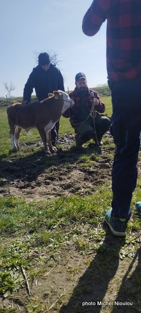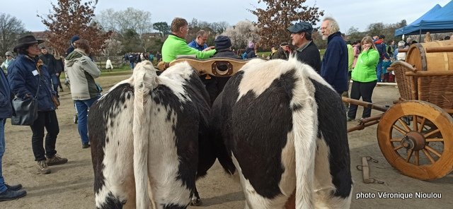 Pour cette rencontre, tous les animaux étaient au collier. Deux paires supplémentaires au joug étaient prévues mais, en dernière minute, elles n’ont pas pu être présentes sur la manifestation. Luc et Agnès mettaient à disposition plusieurs animaux à partir de cinq mois dont le boeuf Réglisse. Jo Durand de Gentioux-Pigerolles (23) était venu avec une jeune vache et Marine Ardoin de Baguer-Morvan (35) avait déplacé son jeune boeuf Froment du Léon.