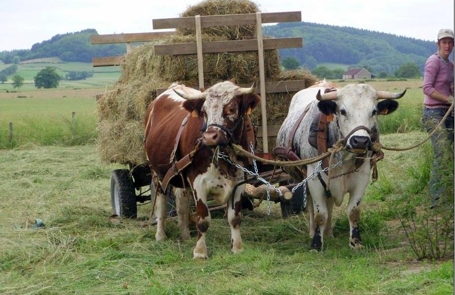 Aujourd’hui, j’ai deux boeufs, dont un encore en cours de dressage, et une vache que je trais depuis un mois. Je travaille au collier, en simple ou en paire ainsi qu’au joug de garrot en paire.