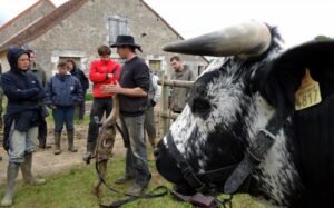 Revenons un peu en arrière dans notre chronologie pour évoquer un grand acteur de la traction bovine – l’Écomusée d’Alsace. En pleine crise d’existence de l’Écomusée en 2006-2007, François Kiesler, chargé du programme de l’agriculture, et le bouvier Philippe Kuhlmann ont malgré tout accueilli la rencontre des Ethnozootechnie Bouviers d’Alsace (Simon, 2007), à laquelle ont participé des spécialistes de la traction chevaline comme Jean-Louis Cannelle du Centre Européen de Ressources et de Recherches en Traction animale (CERRTA) ou Pit Schlechter de la Fédération Européenne du Cheval de Trait pour la promotion de son Utilisation (FECTU). Ces rencontres se sont poursuivies chaque année depuis et ont vite attiré l’attention de participants étrangers – luxembourgeois, belges, britanniques, suisses, et surtout, bon voisinage oblige, de nombreux allemands. Depuis le début, Philippe Kuhlmann a littéralement fait le pont entre Français et Allemands à travers des réunions dans les deux pays, aujourd’hui renforcées par l’accueil de stages de formation de bouviers deux fois par an au sein de l’Ecomusée d’Alsace. Certes, ce n’est pas le seul exemple de formations – le CFPPA de Montmorillon (Coti, 2014), tout comme des privés comme Olivier Courthiade ou Emmanuel Fleurentdidier, en ont proposées – mais c’est sans doute celle avec l’histoire la plus riche et le rayonnement le plus durable.