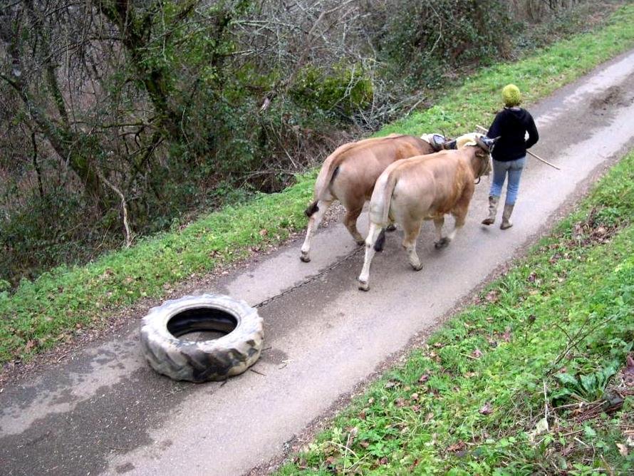 Deux mois passent et l’échographie ne détecte rien. D’échec en échec, il fallait se rendre à l’évidence, il n’y avait rien à faire. Bon! Puisque ma Grive n’était bonne à rien, j’ai voulu prouver qu’elle avait d’autres qualités ! Je me suis mise à lui faire tracter dans un premier temps un pneu. En fait, elle adorait cet exercice, et progressivement une petite herse remplaça le pneu. Cette année-là, j’ai été invitée dans dix foires pour des démonstrations de travail aux champs.