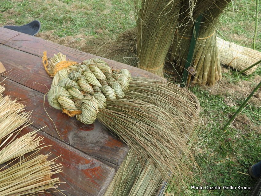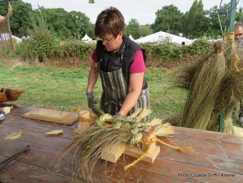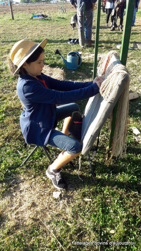 Véronique Nioulou fabriquait des coussins d’attelage de bovin en laîche du modèle « Charollais » et des vire-mouches tressés (modèle Haute-Garonne). Emilie, fille d’éleveur de moutons d’Ouessant exposant sur la fête a été fascinée par le tressage du lin pour réaliser les vire-mouches que Véronique réalise. Elle est restée dès le premier jour sur le stand et a fabriqué aussi bien des coussins d’attelages que les vire-mouches.