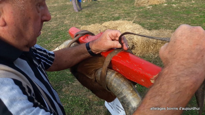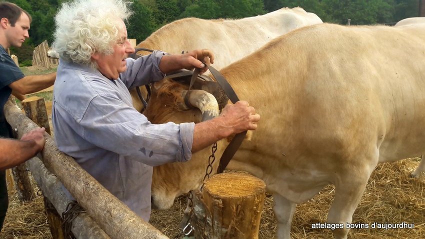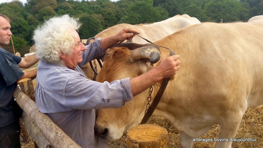 De son côté, Corentin est parti sur une tout autre piste en se laissant inspirer par une observation attentive des avantages et des inconvénients du joug de garrot et du joug de tête. Donc, il invente une transition du premier au deuxième. Or, les bœufs n’ont pas l’habitude du joug de garrot et passent par quelques moments d’hésitation. Pourtant, ils réagissent rapidement et bien à la nouveauté, surtout parce qu’ils ont l’habitude de travailler ensemble, et que Corentin est un meneur expérimenté. Il lui suffit de leur mettre le joug de garrot, de dérouler le coussin feutré sur le front, d’attacher la courroie-ceinture à boucle sur le front, d’enlever la goupille pour détacher les arcs et, voilà, qu’un joug en devient un autre !