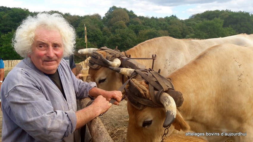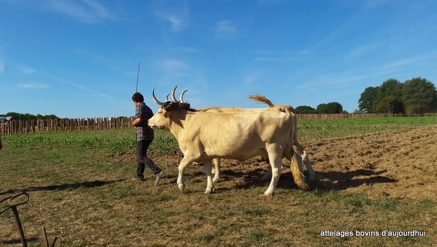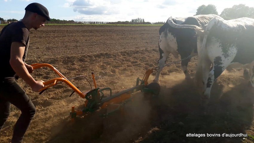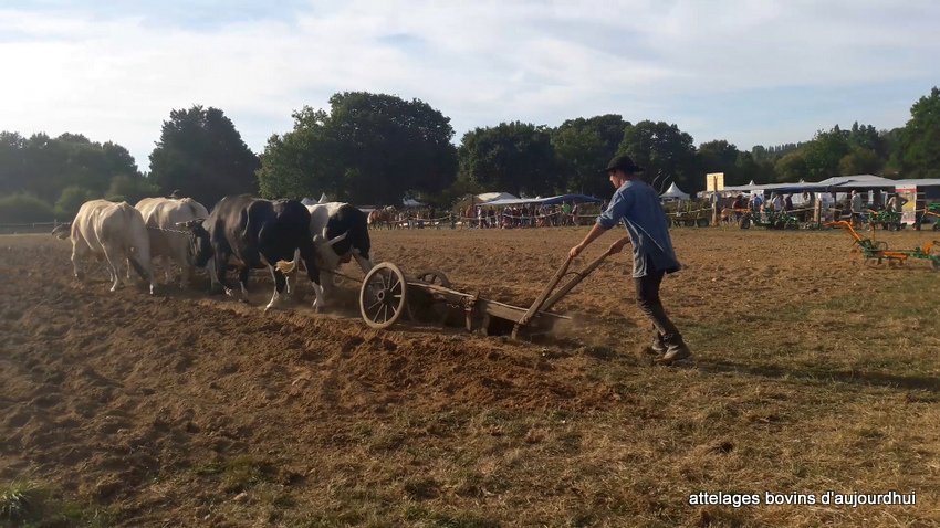 Jean-Bernard Huon qui travaille chez lui ses quinze hectares de terre uniquement avec ses deux paires de boeufs, a labouré tantôt à une paire, tantôt à deux, avec différentes charrues, brabant, Dombasles à rouelle, mais aussi avec des outils modernes proposés par les constructeurs.