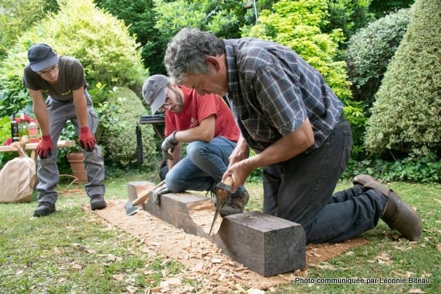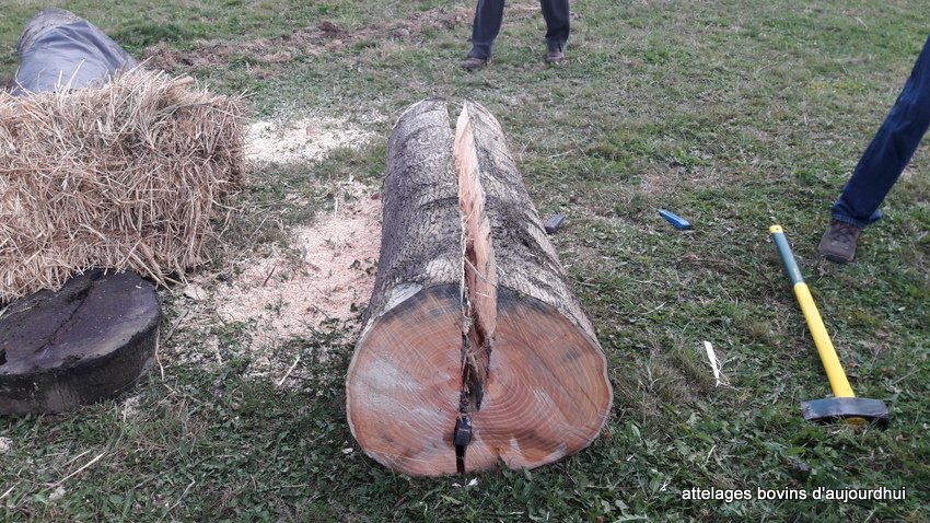 Durant la fête, Lionel Rouanet a taillé un joug du type « Aveyronnais» à partir d’une grume de frêne livrée sur le site dès jeudi soir. Les trois jours de manifestations ont permis d’amener la taille presque à son terme. Les questionnements du public et les explications nombreuses apportées par Lionel ont bien sûr ralenti le travail. Mais le fait que le joug n’ait pas pu être terminé complètement sur trois jours, est la preuve de l’intérêt qu’a pu susciter la présence d’un des derniers (et jeune) jougtiers de France, dont l’apprentissage s’est déroulé auprès de René Alibert, fabricant de jougs réputé de l’Aveyron, disparu en Août 2017.