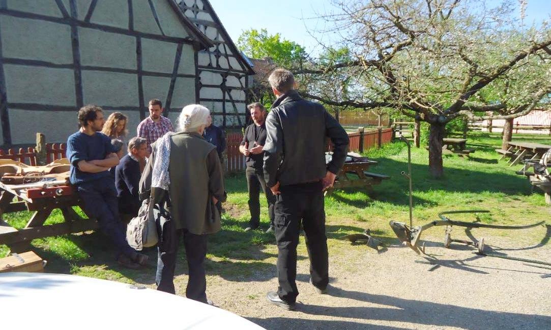En milieu de matinée, une dizaine de personnes de l’académie des bouviers du Puy-Du-Fou nous rendent visite. Le groupe guidé par le dynamique et motivant Laurent Martin, a échangé sur la technique, les différentes formes de jougs, l’attelage, le liage. Cette rencontre a été pour nous l’occasion de croiser des praticiens, apprentis ou confirmés qui travaillent dans l’environnement très spécifique du spectacle, mais dont l’implication dans l’attelage des bovins est très marquée et passionnée.