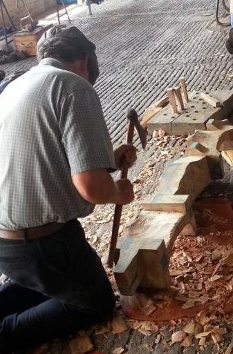 Pour ma part, c’est un joug double que je taille, un modèle de la Loire, à la limite du Puy-de-Dôme, un joug « de montagne » comme le nomme la personne qui me l’a commandé. C’est avec le modèle d’un joug ancien à proximité que je taille la pièce de frêne.
