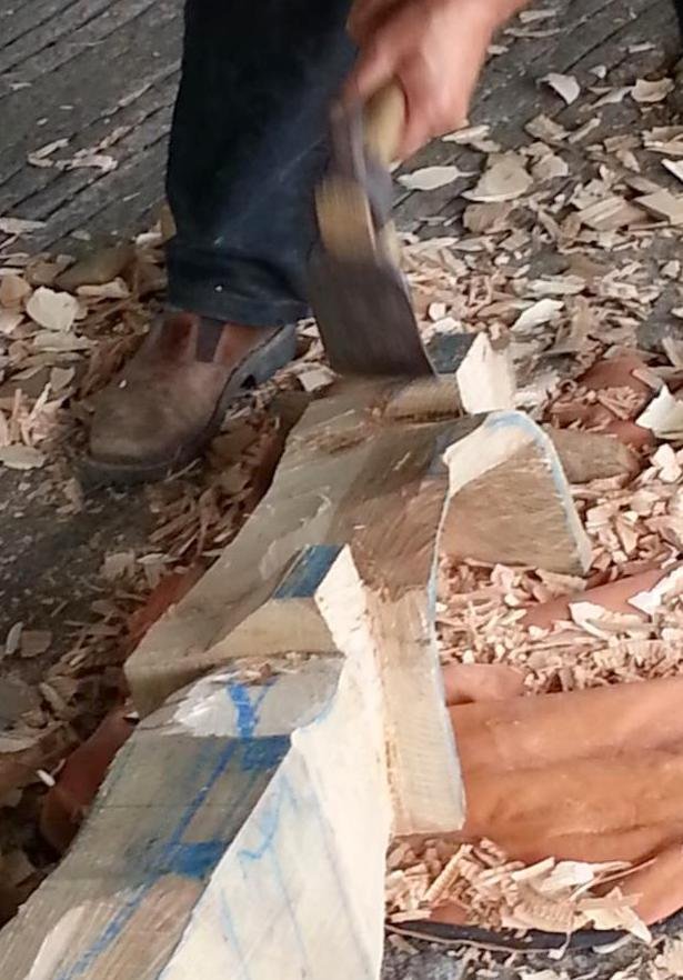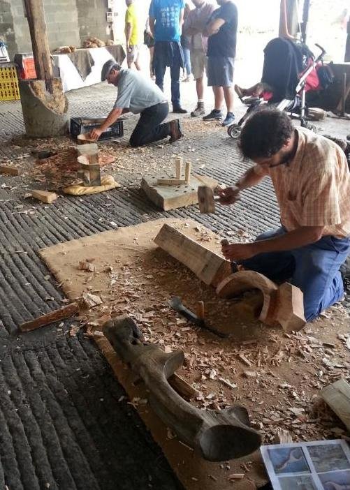 « Depuis le matin, à l’abri du soleil, sous la stabulation, des coups sonores de haches et d’herminettes viennent régulièrement ponctuer l’ambiance de la journée.