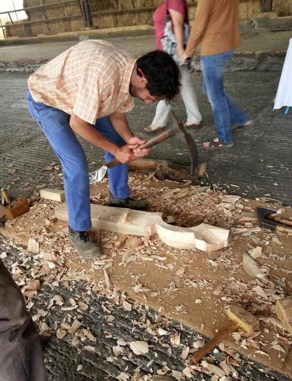 Lionel commence un joug en frêne qui lui a été commandé. Ce dernier, un joug mixte, est destiné à joindre d’un côté un bovin et de l’autre une mule ou un âne.