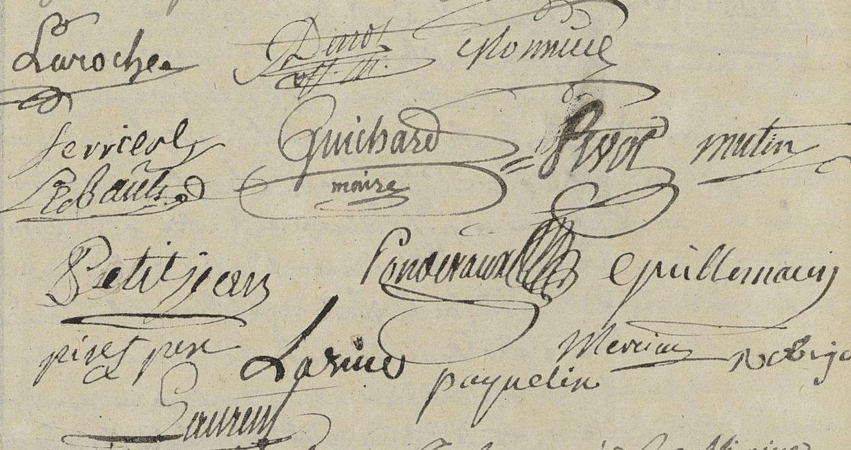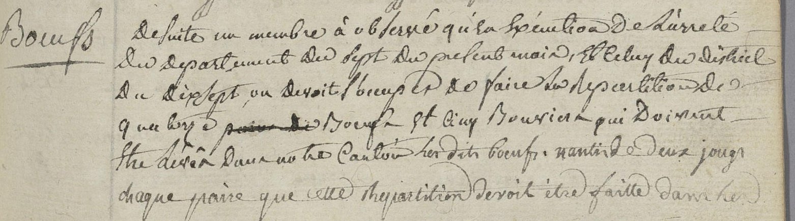 Aujourd’hui 14 pluviose an III, sur les cinq […] de relevées nous maire et officiers municipaux de la commune de cluny nommés par l’arrêtte du district de macon du 27 nivose pour faire la repartition entre les communes de ce canton du contingents des bœufs jougs et bouviers qu’elles étaient dans le cas de fournir d’après larrête du Comité de Salut public du 19 brumaire dernier le dit contingent déterminé pour notre canton à une quantité de quatorze bœufs par autre arrêtté du district du 17 nivose, nous maire et officiers municipaux après avoir fait la repartition entre les dites communes le 25 dudit mois de nivose leur avait fait parvenir les ordres et instructions tendantes à leur faire fournir leur contingent chacune en cequi les concerne et leur avait a cet éffet de se trouver cejourdhuÿ et faire trouver leurs bœufs garnis de leurs jougs avec leurs propriétaires leurs experts pour conjointement avec REBOUX expert nommé par le district, et DUMONT ainé nommé de notre part faire l’estimation des dits bœufs et jougs et recevoir ensuite le montant de la dite estimation un mandat par nous signé par le receveur du district. La commune de cluny à fourni les deux céans [ici], celles de Blanot Cortambert et Donzy le Perthuis deux, celles de Lavineuse et Massy deux, quant aux autres communes aucunes non présenté ni donné leurs motifs à l’exception de Joseph DECHAISE de Donzy Lenational et qui sans être assisté d’officiers municipaux en droit ni de