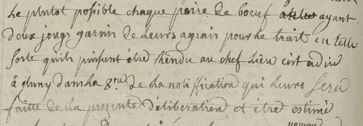 le plutot possible chaque paire de bœuf ayant deux jougs garnis de leurs agrais pour le trait en telle sorte qu’ils puissent être rendu au chef lieu c’est adire à cluny dans la 8ne [huitaine] de la notiffication qui leurs sera faitte de la prezente déliberation et être estimé par le citoyen DUMONT ainsi que la commune nomme pour expert conjointement avec celuy du district et celuy quil plaira au propriétaire de choizir en prézence de deux officiers municipaux qui dresseront procès verbal de cette operation et de suitte il sera tiré mandat sur le receveur du district pour obtenir payement lequel mandat sur le viza du district sera de faitte acquitté et ont tous les membres
